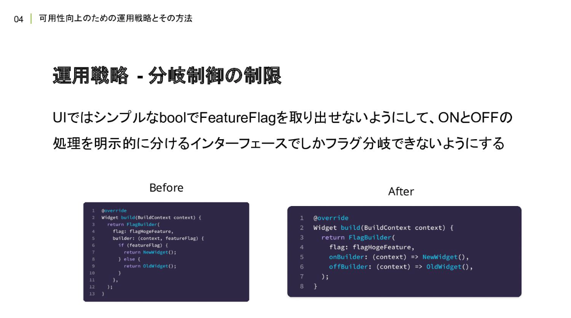 発表の中で特に印象的だったのは、UI層でのFeatureFlagの扱い方で、FeatureFlagをラップしたFlagBuilderというWidgetを用いているという点です。